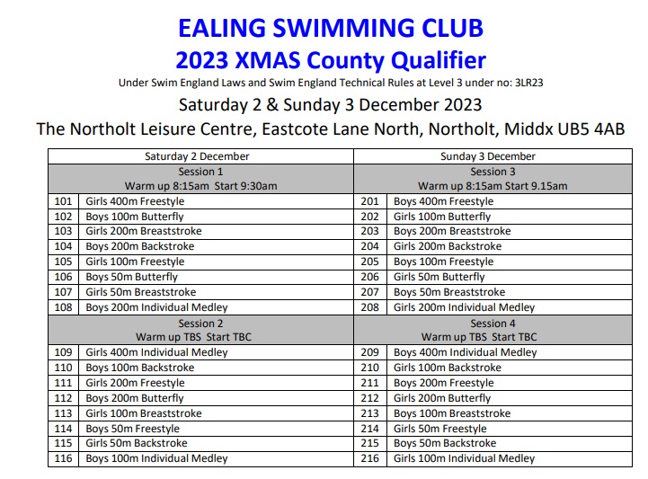 This meet is for all swimmers and is a great chance to achieve county qualifying times before Christmas. For many swimmers, this will be their final competition before heading off for the Christmas holidays.